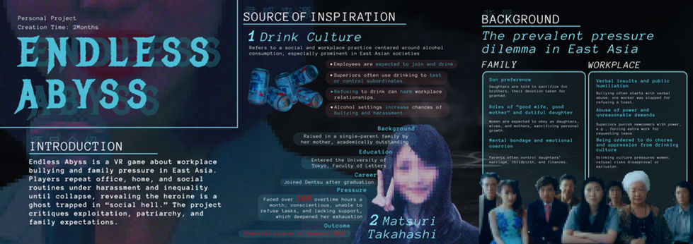 Endless Abyss is a VR game about workplace bullying and family pressure in East Asia. Players repeat office, home, and social routines under harassment and inequality until collapse, revealing the heroine is a ghost trapped in “social hell.” The project critiques exploitation, patriarchy, and family expectations.